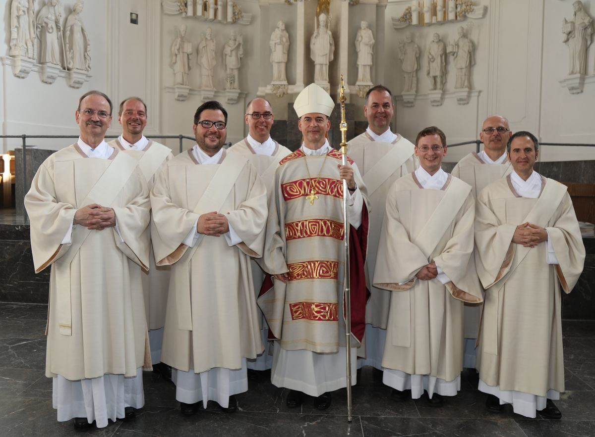 Mit der Weihe verpflichten sich die Diakone, das Stundengebet zu pflegen. Dieses sei keine private Frömmigkeitsübung, sondern das Gebet der ganzen Kirche. „Gemeinsam mit allen Amtsträgern sind Sie aufgerufen, sich einzureihen in die Schar der Beter, die täglich stellvertretend für andere beten.“ Zudem sei den Diakonen aufgetragen, das Leben der Menschen aus dem Glauben zu deuten und ihnen in der Spendung der Sakramente und Sakramentalien zur Begegnung mit Christus zu verhelfen. „Diakon kann nur sein, wer die Bereitschaft zum Einsatz für andere mitbringt“, betonte Bischof Jung weiter. Wer sich zugunsten anderer dem Heilswillen Gottes unterordne, der könne ins Schwitzen kommen. „Und das ist gut. Denn nur in diesem Ringen wird es möglich, dass wir nicht nachlassen in unserem Dienst, sondern uns immer wieder neu für Christus und seine Sendung entscheiden.“ Besonders dankte der Bischof den Ehefrauen und Familien der neuen Diakone für deren Unterstützung.