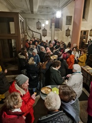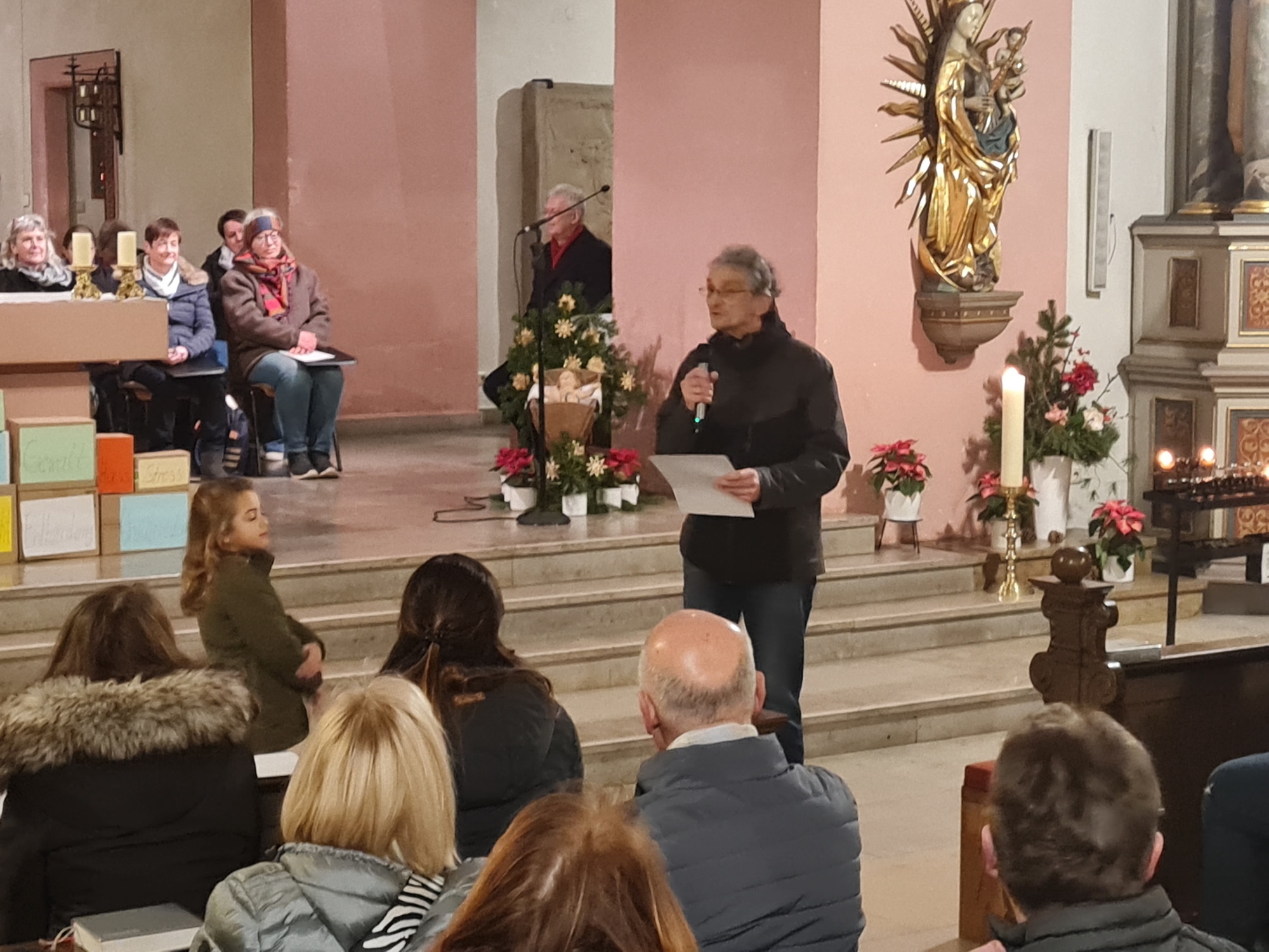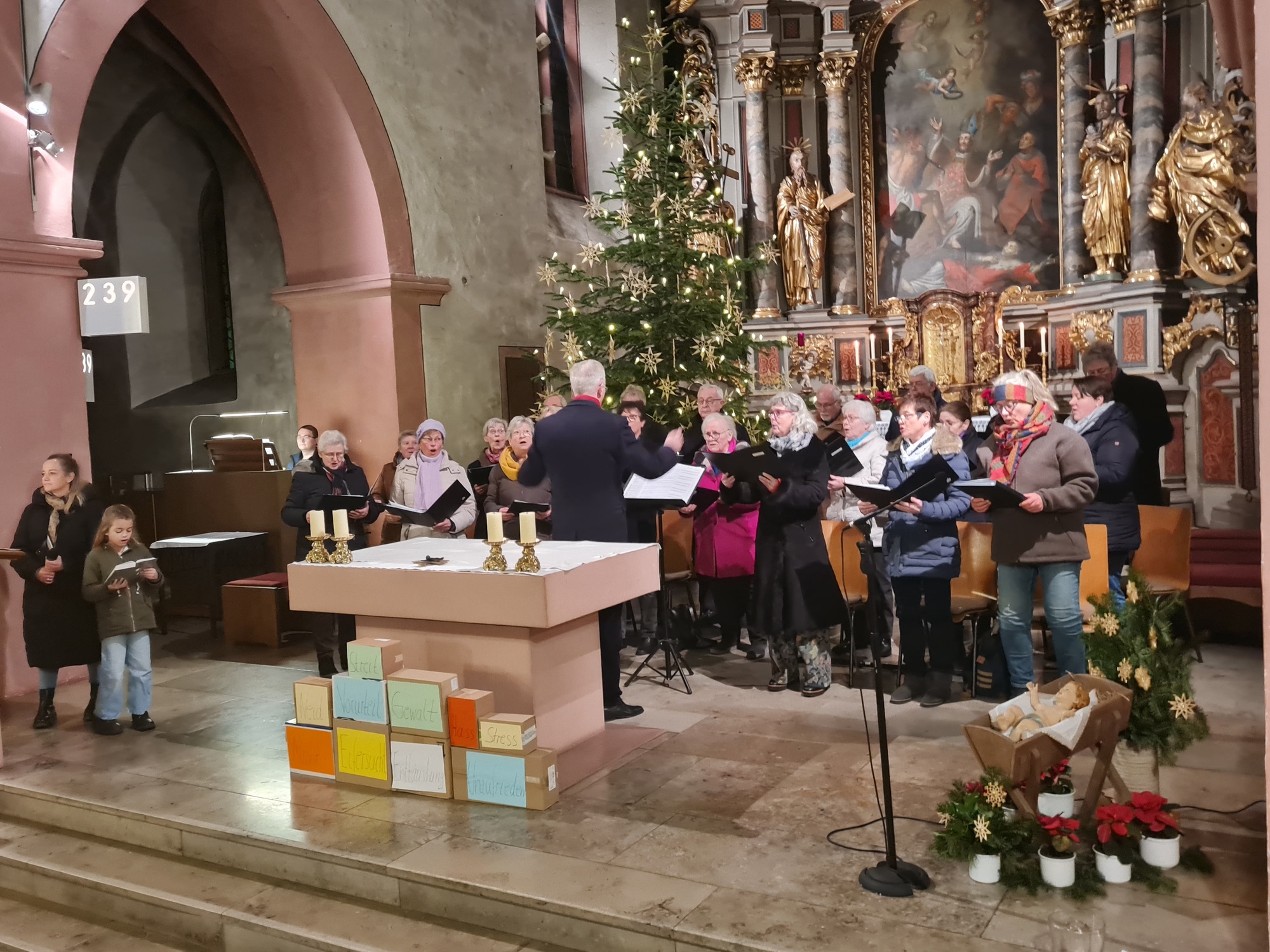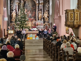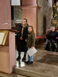 Ebenso herzlich stelle Nora den Leiter des Kirchenchores, Herrn Dr. Wolfgang Heuring, vor. Dieser erklärte, dass die Aufgabe des Kirchenchores nicht nur die Darbietung von solistischen Aufführungen sei, sondern als Teil der Gemeinde die Gottesdienste festlich mitzugestalten. Und so wurde das Lied „Zu Bethlehem geboren“ in verschiedenen Besetzungen des Chores abwechselnd mit den Besucherinnen und Besuchern gesungen, die letzte Strophe gemeinsam dem 4-stimmigen Chor und einer Überstimme. Mitreißend und überwältigend. Zurecht auch hier viel Applaus.