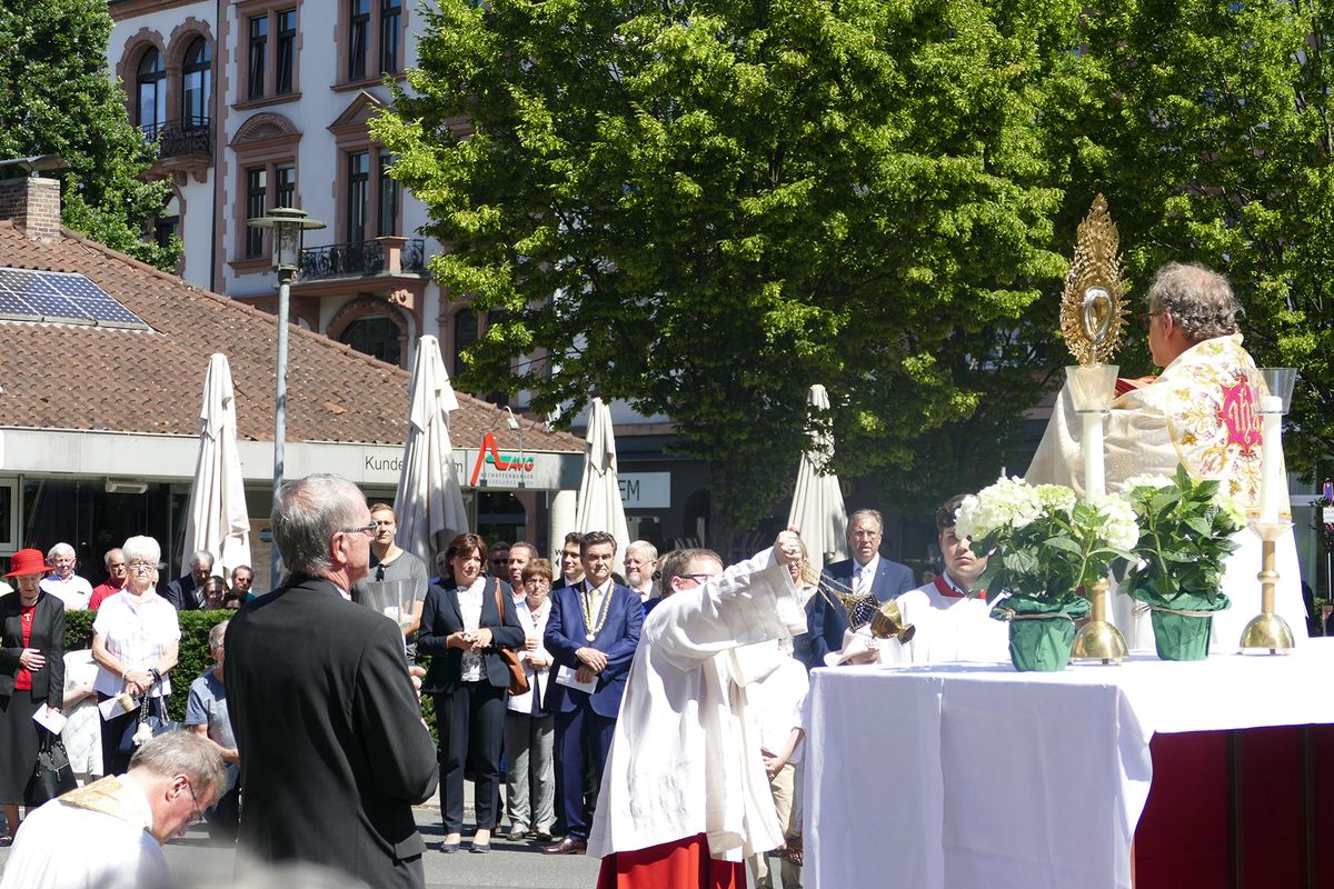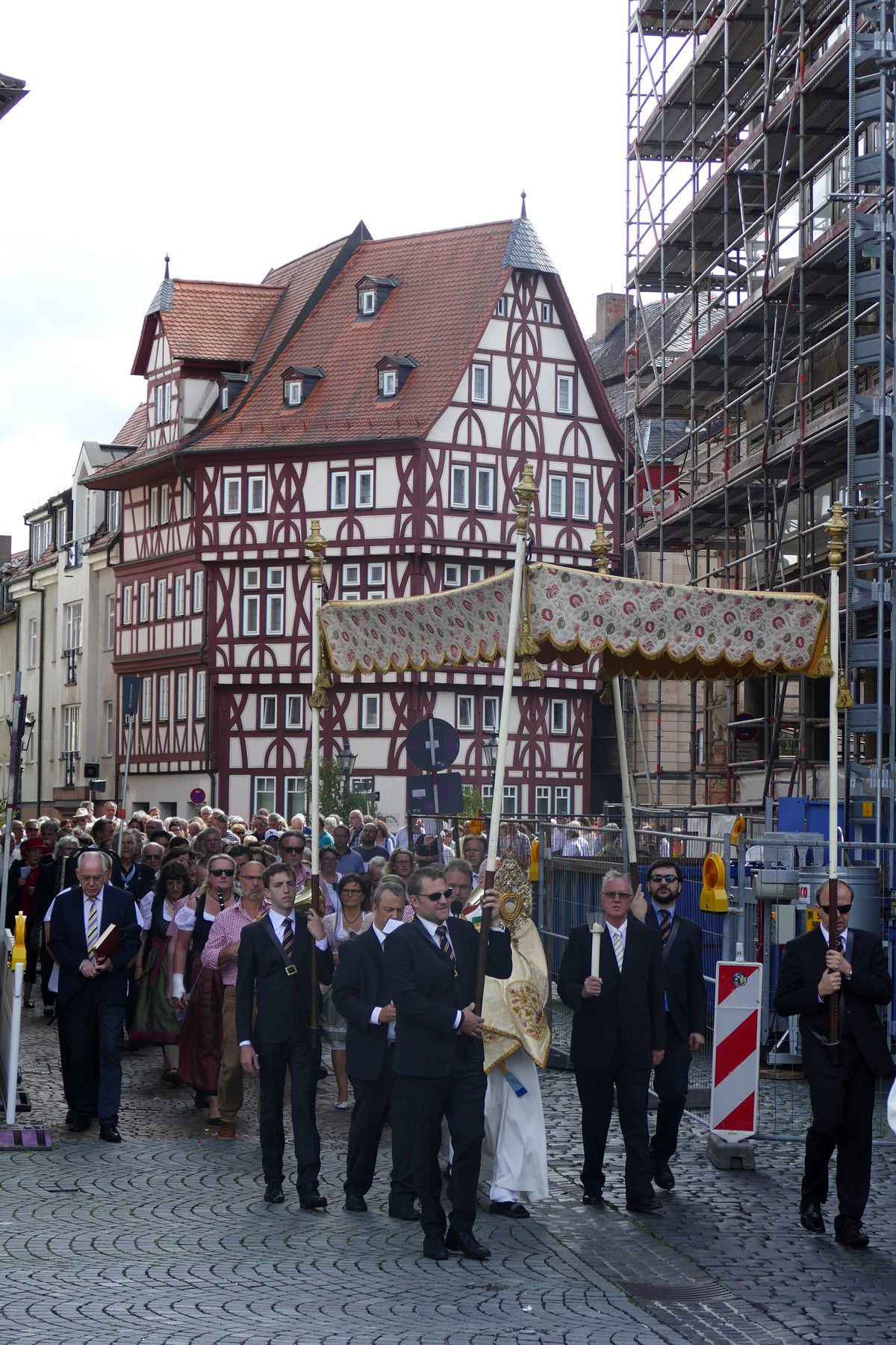 Begleitet von den Gläubigen aus der Pfarreiengemeinschaft Würzburg-Innenstadt trug Bischof Jung im Anschluss an den Pontifikalgottesdienst die Monstranz mit dem Allerheiligsten durch die Straßen. Domkapitular Dr. Jürgen Vorndran und Domvikar Regens Stefan Michelberger assistierten dem Bischof unter dem Tragehimmel. Weihbischof Ulrich Boom, Bischof em. Dr. Friedhelm Hofmann, Mitglieder des Domkapitels, Ordensmänner, Ritter vom Heiligen Grab, Familiaren des Deutschen Ordens und Mitglieder des Malteserordens sowie Verbände, Vereine, Studentenverbindungen und Innungen gingen dem Allerheiligsten voran. Kommunionkinder streuten Blumen. Hinter dem Tragehimmel liefen Oberbürgermeister Christian Schuchardt, Bürgermeister Dr. Adolf Bauer sowie Ordensfrauen. Viele Häuser entlang des Prozessionsweges waren mit Blumen und Fahnen geschmückt. Die Texte der Prozession hatten das Liturgiereferat und das Referat Geistliches Leben des Bischöflichen Ordinariats Würzburg gemeinsam erarbeitet.