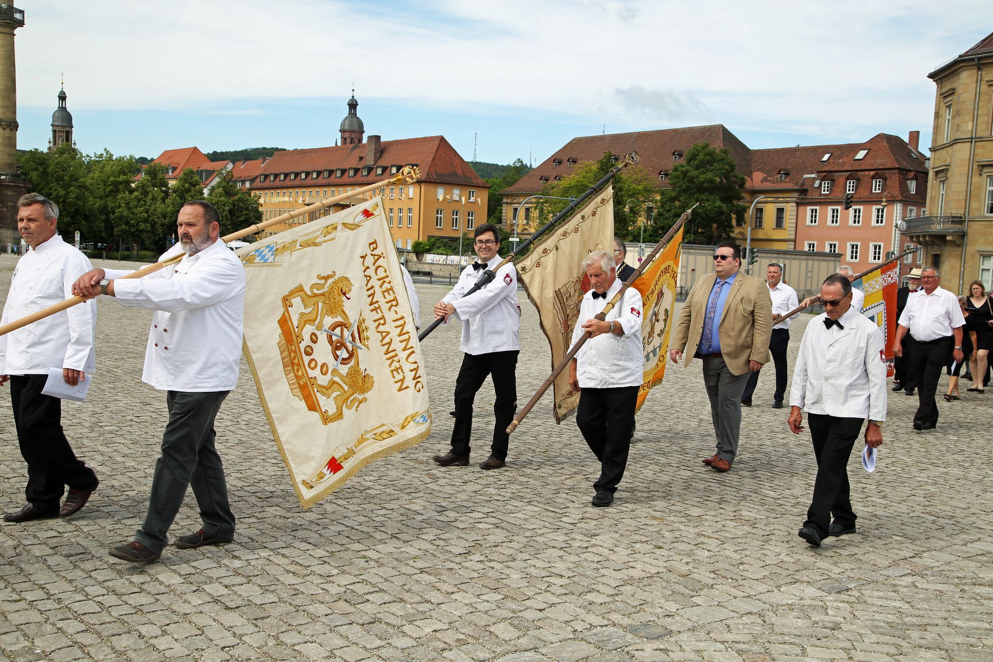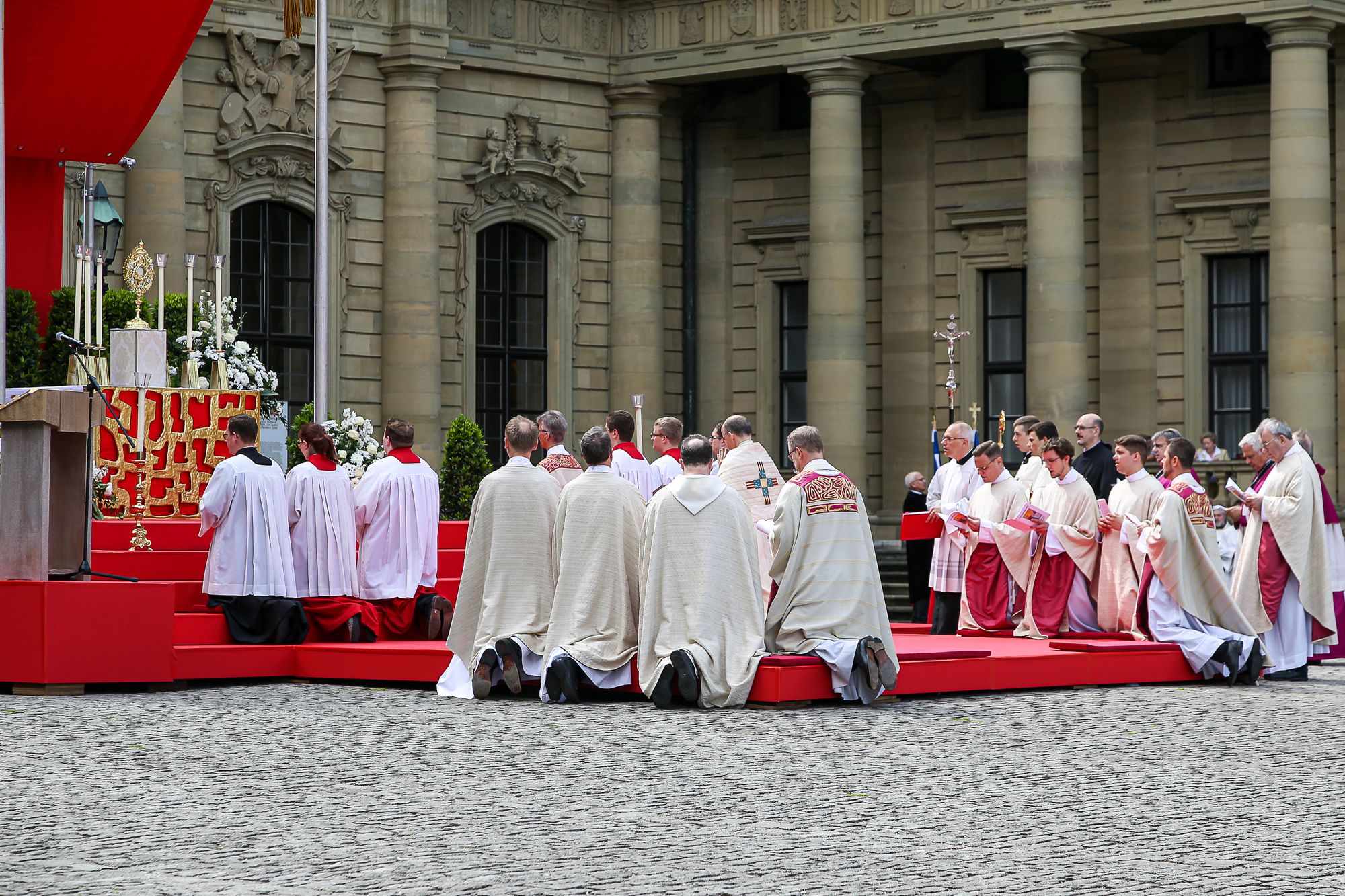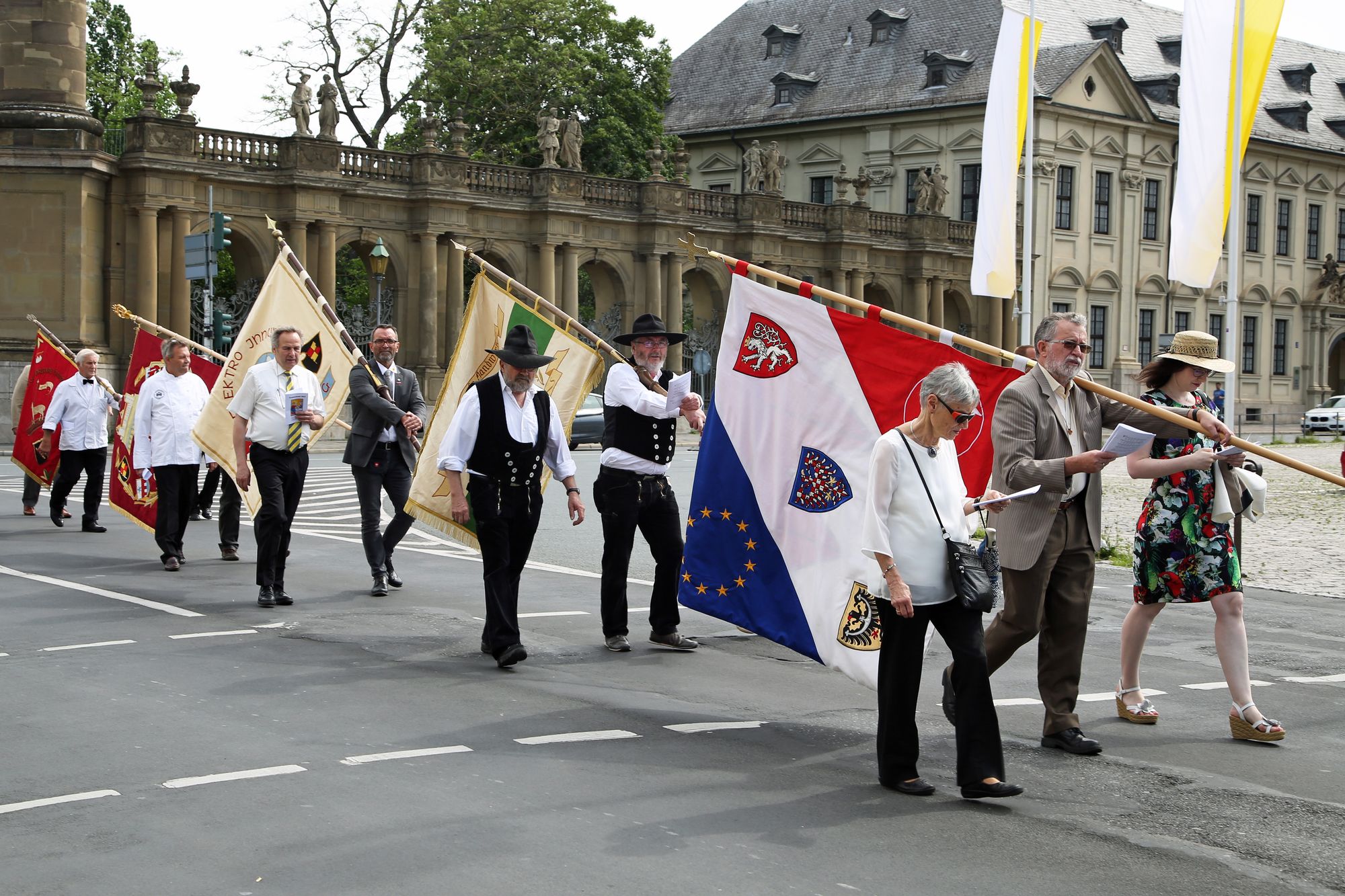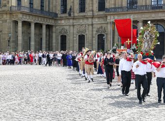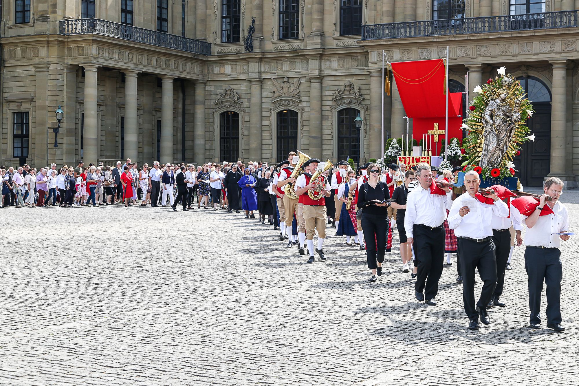 Begleitet von den Gläubigen aus der Pfarreiengemeinschaft Würzburg-Innenstadt trug Bischof Jung im Anschluss an den Pontifikalgottesdienst die Monstranz mit dem Allerheiligsten durch die Straßen. Domkapitular Dr. Jürgen Vorndran und Domvikar Regens Stefan Michelberger assistierten dem Bischof unter dem Tragehimmel. Weihbischof Ulrich Boom, Bischof em. Dr. Friedhelm Hofmann, Mitglieder des Domkapitels, Ordensmänner, Ritter vom Heiligen Grab, Familiaren des Deutschen Ordens und Mitglieder des Malteserordens sowie Verbände, Vereine, Studentenverbindungen und Innungen gingen dem Allerheiligsten voran. Kommunionkinder streuten Blumen. Hinter dem Tragehimmel liefen Oberbürgermeister Christian Schuchardt, Bürgermeister Dr. Adolf Bauer sowie Ordensfrauen. Viele Häuser entlang des Prozessionsweges waren mit Blumen und Fahnen geschmückt. Die Texte der Prozession hatten das Liturgiereferat und das Referat Geistliches Leben des Bischöflichen Ordinariats Würzburg gemeinsam erarbeitet.