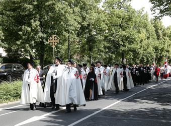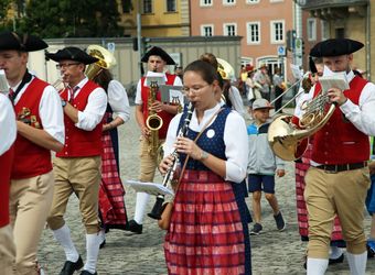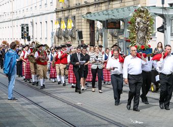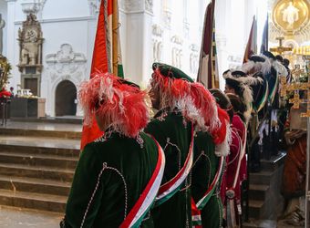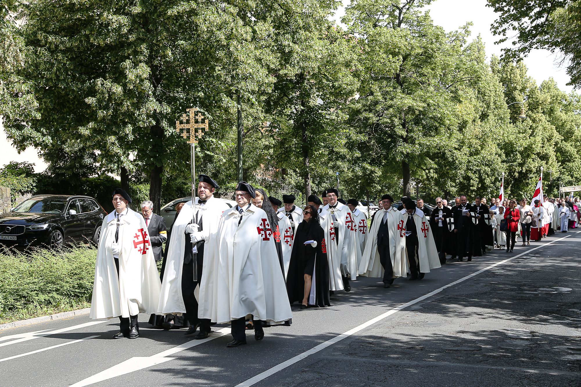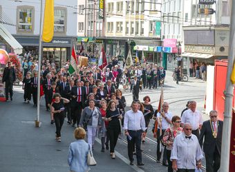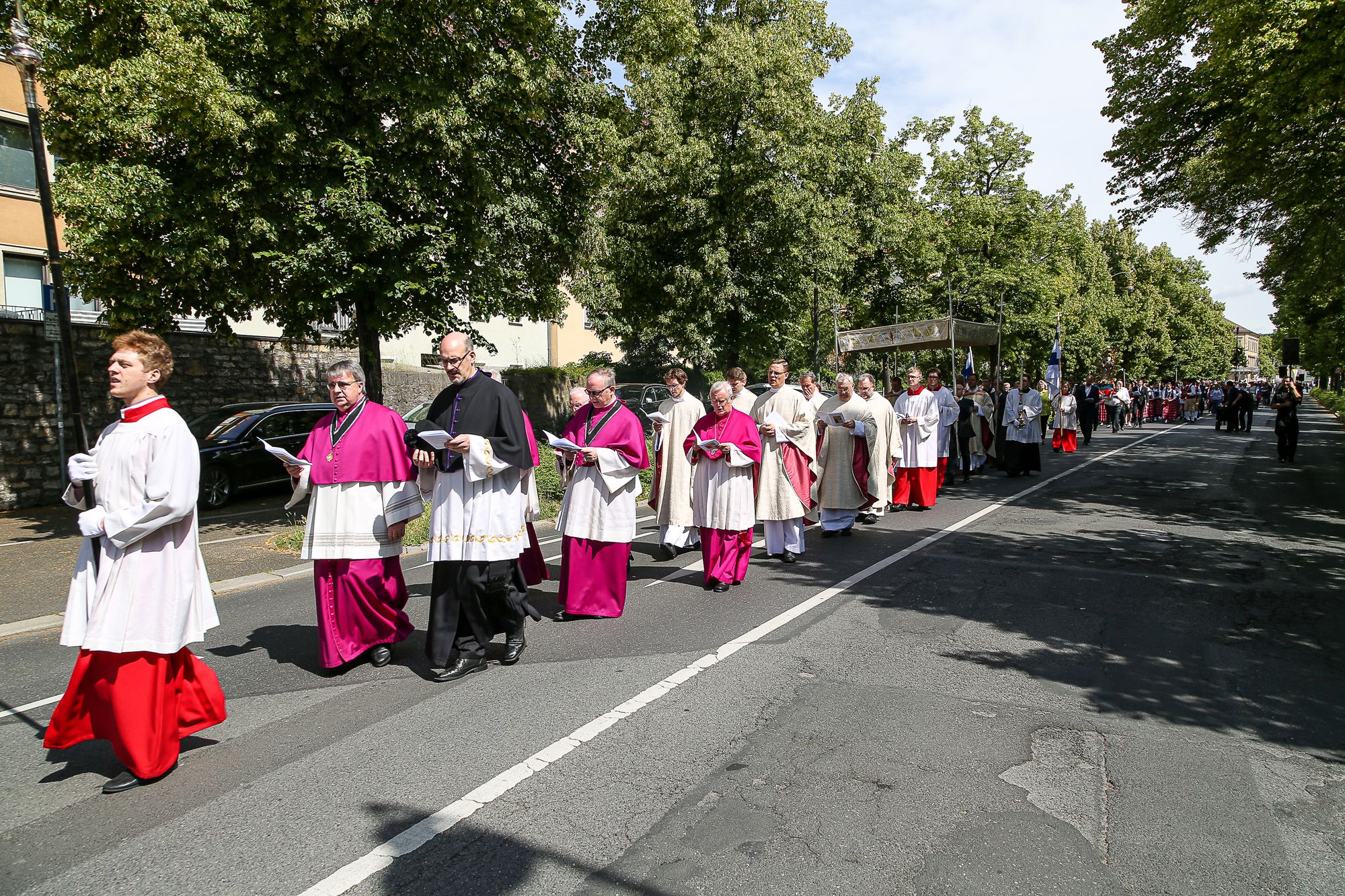 Die Fronleichnamsprozession in der Aschaffenburger Innenstadt zählte mehr als 400 Teilnehmer. Beteiligt waren die Pfarreiengemeinschaft „Sankt Martin – Aschaffenburg/Innenstadt“, die Pfarrei Herz Jesu, die Pfarreien des Stadtteils Schweinheim sowie die italienische, die kroatische und die polnische Gemeinde. Der Festgottesdienst fand nicht wie angekündigt auf dem Stiftsplatz, sondern in der Stiftsbasilika statt, da für den Vormittag Gewitter gemeldet waren. Doch die Wolken hatten sich bald wieder verzogen, so dass die Prozession bei strahlendem Sonnenschein durch die Innenstadt ziehen konnte. Das Motto lautete diesmal „Europa und seine Patrone“. Damit wolle man kurz nach der Europawahl deutlich machen, dass die kulturelle Vielfalt des Kontinents auch durch das Christentum geprägt sei, erklärte Stiftspfarrer Martin Heim. Das aktuelle Beispiel Greta Thunberg zeige, dass einzelne Menschen etwas in Bewegung bringen können. Wenn sie für ihre Botschaft auch Verantwortung übernähmen, dann würden sie zu einer Art Ikone, einem Vorbild im Handeln. Die heilige Brigitta ist nach Heims Worten so ein Vorbild. „Sie hatte selbst acht Kinder geboren und ist bis heute ein Beispiel, was gelebter Glaube in einer Familie bewirken kann.“ Nach dem Tod ihres Mannes wurde sie Ordensschwester, widmete ihr Leben der geistlichen Betrachtung und konnte als Beraterin für eine Friedenspolitik wirken.