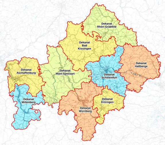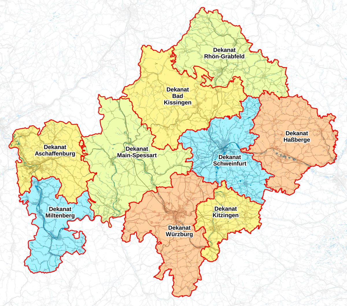 Die neuen Dekanate sind: Dekanat Aschaffenburg (bisher Aschaffenburg-Stadt, -Ost, -West sowie Alzenau), Dekanat Bad Kissingen (bisher Bad Kissingen, Hammelburg), Dekanat Haßberge, Dekanat Kitzingen, Dekanat Main-Spessart (bisher Lohr, Karlstadt), Dekanat Miltenberg (bisher Miltenberg, Obernburg), Dekanat Rhön-Grabfeld (vormals Bad Neustadt), Dekanat Schweinfurt (bisher Schweinfurt-Stadt, -Nord, -Süd) und Dekanat Würzburg (bisher Würzburg-Stadt, -rechts des Mains, -links des Mains sowie Ochsenfurt).