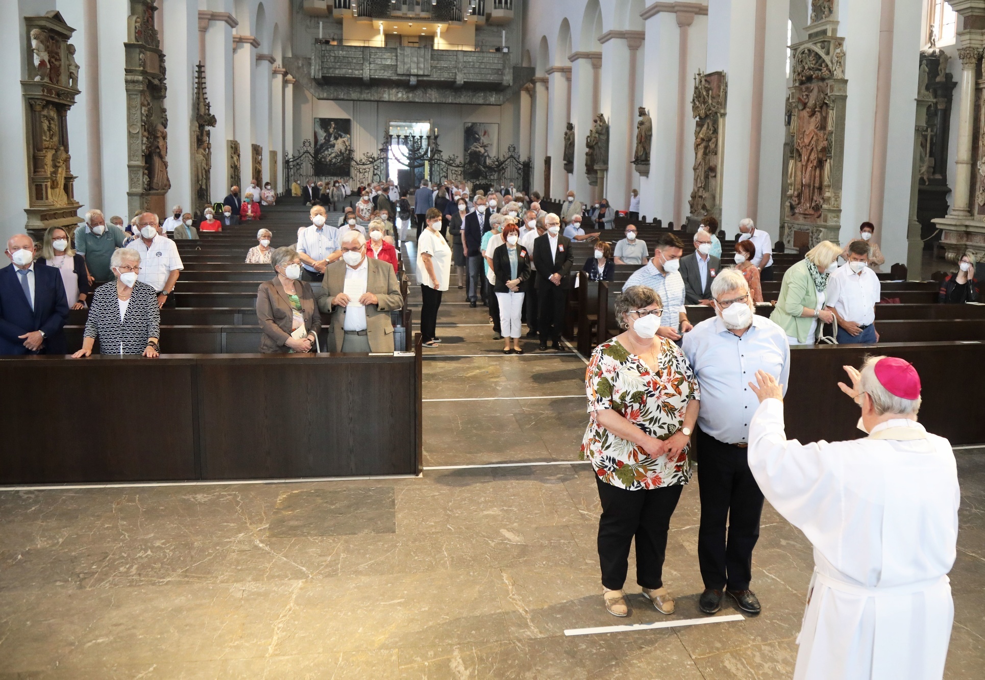Würzburg (POW) Mit rund 110 Ehepaaren aus dem ganzen Bistum hat Bischof em. Dr. Friedhelm Hofmann am Mittwochvormittag, 23. Juni, einen Pontifikalgottesdienst für Ehejubilare gefeiert, die in den Jahren 2020 und 2021 auf 50, 60 oder 65 gemeinsame Jahre zurückblicken. „Ich danke Ihnen allen für Ihr Zeugnis“, sagte Bischof Hofmann zu den Gläubigen, die den Gottesdienst im Würzburger Kiliansdom unter den aktuellen Corona-Beschränkungen feierten. „Sie zeigen deutlich, dass die Ehe kein Auslaufmodell unserer Gesellschaft, sondern im Gegenteil Grundlage eines prosperierenden Gemeinwohls ist. Ehe hat Zukunft!“ Im vergangenen Jahr mussten die Gottesdienste für die Ehejubilare aufgrund der Coronapandemie entfallen. Deshalb werden in diesem Jahr insgesamt 18 Gottesdienste für Ehejubilare gefeiert, die in den Jahren 2020 und 2021 ihr silbernes beziehungsweise goldenes, diamantenes oder eisernes Ehejubiläum begehen. Trotz der Coronakrise seien die Menschen in der Kirche beheimatet und erführen Gottes Liebe, erklärte Bischof Hofmann.