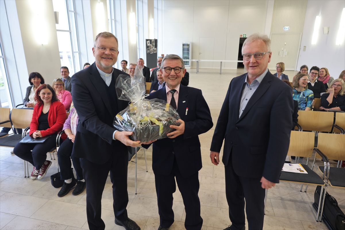 Würzburg (POW) Rund 41 Jahre hat Wolfgang Bullin (66) im Dienst des Bistums Würzburg gearbeitet, davon seit 1996 als Chefredakteur des Würzburger katholischen Sonntagsblatts. „Eine Ära geht zu Ende“, erklärte Bernhard Schweßinger, Leiter des Medienhauses der Diözese Würzburg, am Donnerstag, 18. April, bei der Verabschiedung Bullins in den Ruhestand. Neben zahlreichen aktuellen und ehemaligen Mitarbeiterinnen und Mitarbeitern der Würzburger Kirchenzeitung nahmen auch Weggefährten aus der bundesweiten Bistumspresse an der Feierstunde im Würzburger Burkardushaus teil und wünschten Bullin alles Gute für den neuen Lebensabschnitt.