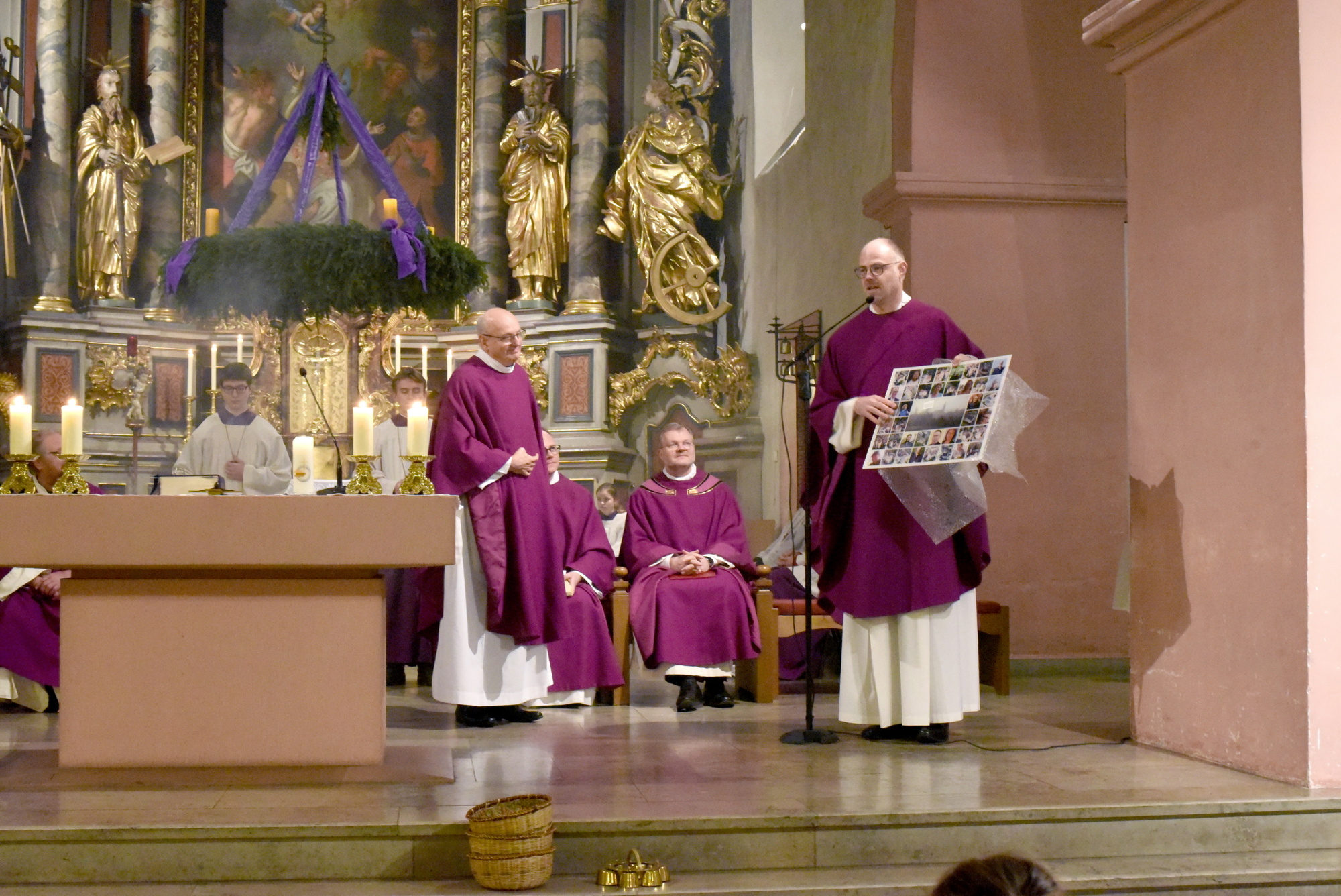 Am Ende des Gottesdienstes begann ein kleiner Reigen von Grußworten. Sonja Großmann sprach als Vorsitzende des Rates im Pastoralen Raum. Sie begrüßte Pfarrer Steffen Behr und wünschte ihm, dass er sich schnell im Streutal einlebe. Pfarrer Thomas Menzel gratulierte sie zum 15-jährigen Priesterjubiläum und zur Ernennung zum Moderator. An Pfarrvikar Dr. Piotr Bruski richtete sie zum Abschied herzliche Worte. Im Namen der evangelischen Pfarrerinnen und Pfarrer im Gebiet des Pastoralen Raumes übermittelte Pfarrer Andreas Werner herzliche Grüße. Bürgermeister Martin Link aus Stockheim richtete als Vorsitzender der Streutalallianz das Wort an Pfarrer Behr, Pfarrer Menzel und Pfarrvikar Dr. Bruski. Und Bürgermeister Tobias Seufert sagte im Namen der Gemeinde Bastheim ein extra „Adieu“ zu Pfarrvikar Dr. Bruski, der in den vergangenen 6 Jahren im Bastheimer Pfarrhaus wohnte. Pfarrer Thomas Menzel überreichte im Namen des Pastoralteams eine Collage mit Bildern aller 24 Kirchtürme des Pastoralen Raumes sowie Portraits aller Mitarbeiterinnen und Mitarbeiter im Pastoral- und Verwaltungsteam der vergangenen 6 Jahre.
