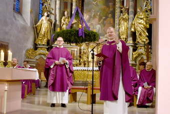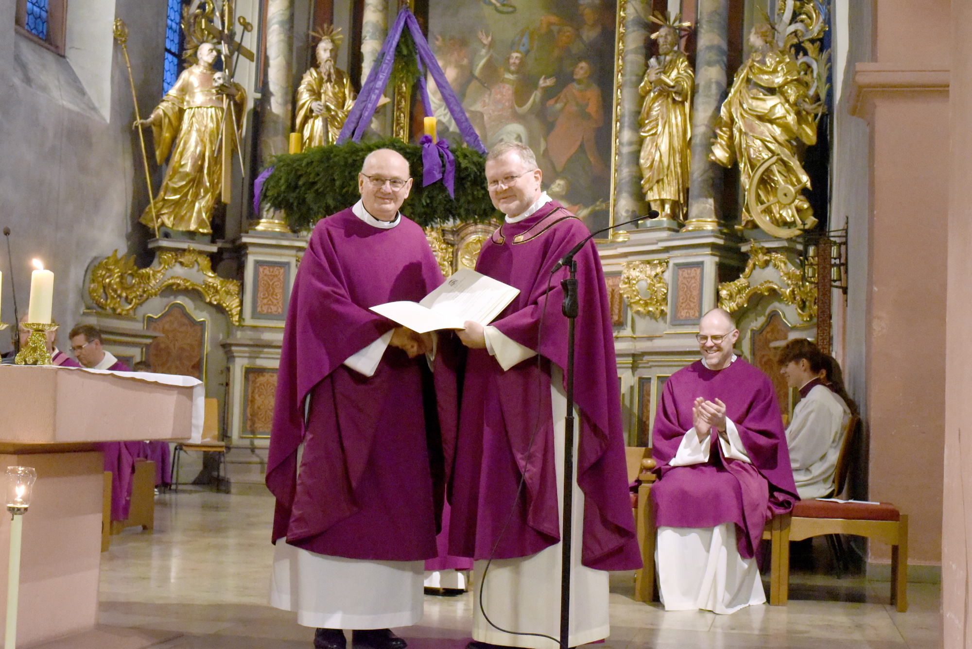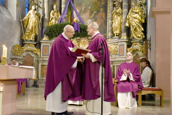 Zunächst aber wandte sich Generalvikar Dr. Vorndran an Pfarrvikar Piotr Bruski, der aufgrund seiner gesundheitlichen Einschränkungen um den Ruhestand gebeten hat. Der Generalvikar dankte Bruski für seine fruchtbare Tätigkeit im Bistum Würzburg und wünschte ihm für die nun beginnende Zeit alles Gute und Gottes Segen. Ihm wurde die bischöfliche Urkunde überreicht.