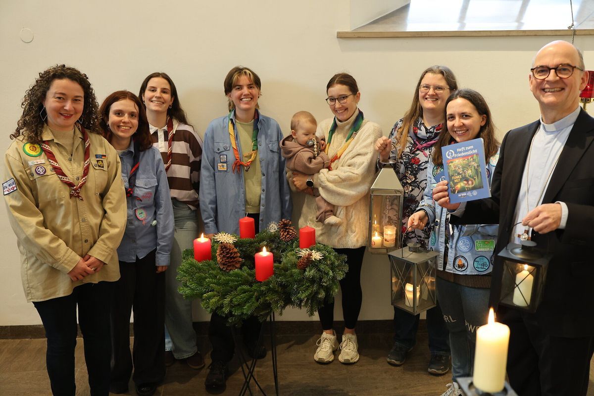 Bischof Dr. Franz Jung dankte den Frauen für das wertvolle Zeichen. Mit der in der Geburtsgrotte Jesu in Betlehem entzündeten Flamme werde jedes Jahr ein Symbol des Friedens in die Welt getragen. „Angesichts der Zerrissenheit im Heiligen Land ist das ein besonders wichtiges Signal“, betonte der Bischof. Zugleich sei jeder Friede ein Prozess und kein Zustand. Gemeinsam mit den Pfadfinderinnen betete er besonders für die Menschen im Heiligen Land. Das Friedenslicht von Betlehem kann auf dem Parkplatz vor der Jugendkirche, Ottostraße 1 in Würzburg, bis einschließlich 6. Januar 2026 abgeholt werden. Ein in Würzburg erstelltes Begleitheft steht unter dpsgw.de/friedenslichtheft zum Download bereit. Die Aktion Friedenslicht in Deutschland geht auf die Initiative „Licht ins Dunkel“ des Österreichischen Rundfunks ORF zurück. Jedes Jahr entzündet ein Kind aus Österreich in der Geburtsgrotte Jesu in Betlehem das Friedenslicht. Am Samstag vor dem zweiten Advent wird die kleine Flamme der Hoffnung in einer ökumenischen Aussendungsfeier in Österreich an die internationalen Pfadfinderinnen- und Pfadfinderdelegationen weitergegeben. Von dort aus tragen sie das Licht weiter – nach Europa und darüber hinaus in viele Länder der Welt. Nach Würzburg kam das Friedenslicht von Linz aus mit dem Auto.