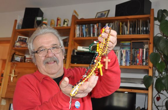 Der Schweinfurter Elmar Rachle hat bereits mehr als 30 Rosenkränze für die Aktion gesammelt. Rachle gehört der Weggemeinschaft der Würzburger Ritaschwestern an. Dort tauscht er sich regelmäßig mit anderen Christinnen und Christen aus. Bei einer Fahrt der Ritaschwestern ins italienische Cascia habe er auch erstmals von der Aktion „Ein Rosenkranz geht um die Welt" erfahren. Der ausgebildete Umwelt- und Abfallberater Rachle war sofort begeistert: „Mir liegt zum einen am Herzen, dass geweihte Rosenkränze nicht in Schubladen rumliegen oder sogar in den Müll wandern, zum anderen freue ich mich über jeden Gegenstand, der wieder eine sinnvolle Verwendung findet."