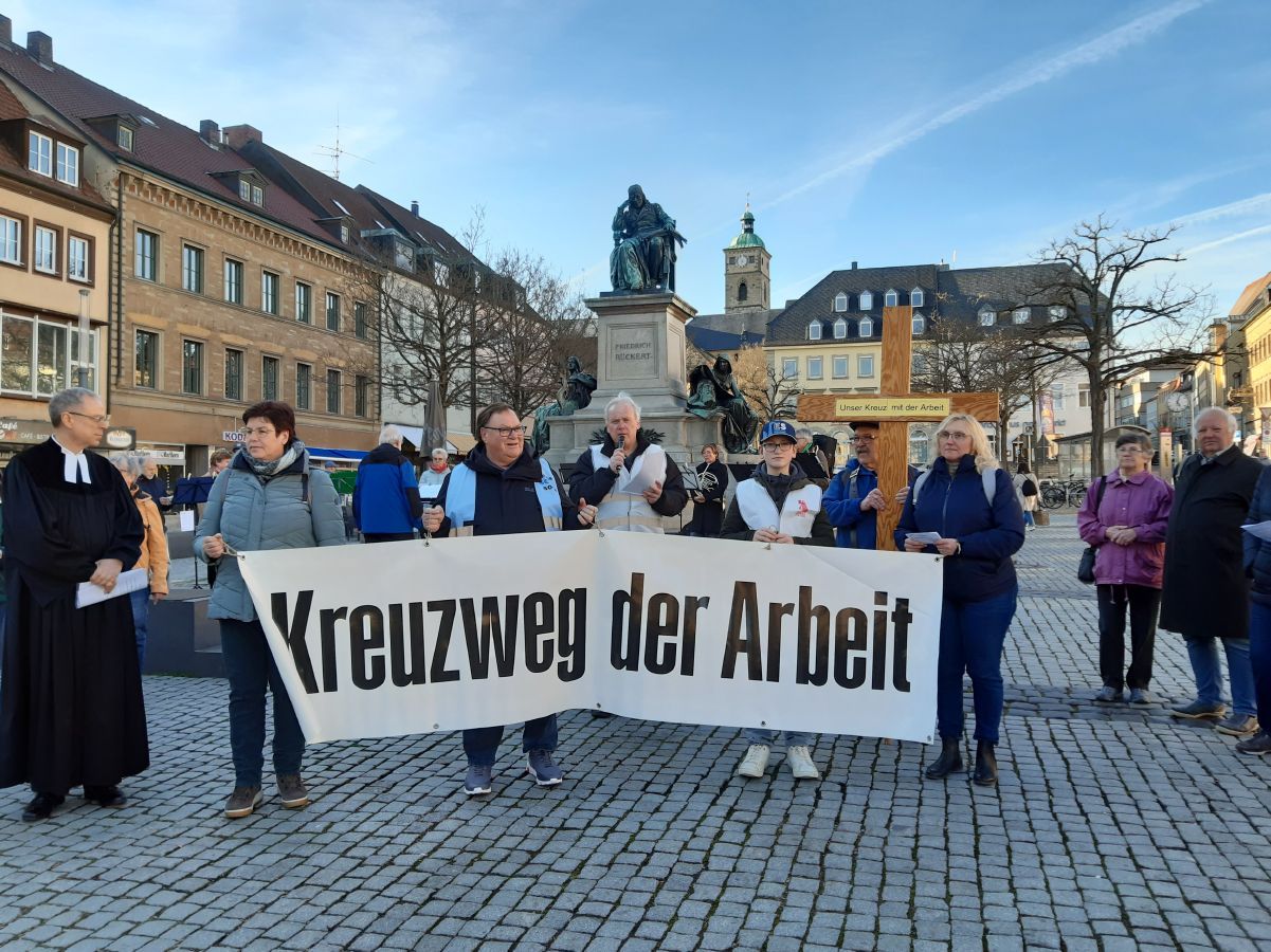 Seit mehr als 20 Jahren trügen ehrenamtliche und hauptamtliche Mitarbeiterinnen und Mitarbeiter aus dem Kirchlichen Dienst in der Arbeitswelt (KDA), der Aktionsgemeinschaft für Arbeitnehmerfragen (afa), der KAB und der Betriebsseelsorge Themen und Probleme in der Arbeitswelt in die Öffentlichkeit, sagte Günter Webert, Vorsitzender des KAB-Stadt- und Kreisverbands. Sie gingen auf die Straße für Menschen, die in der Arbeitswelt Situationen des Leides und des Kreuzes erfahren, und forderten dazu auf, eine lebenswerte Zukunft für die Stadt Schweinfurt zu gestalten.