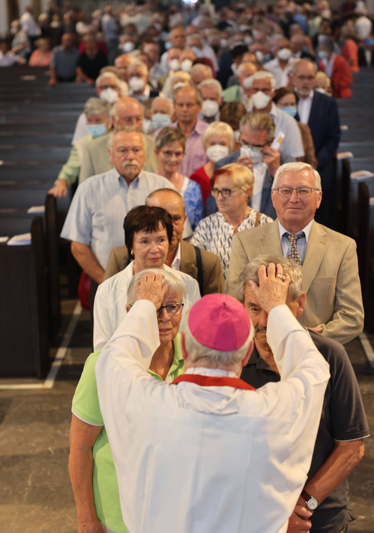 Würzburg (POW) Mit rund 200 Ehepaaren, die auf 50, 60 oder 65 gemeinsame Jahre zurückblicken, hat Bischof em. Dr. Friedhelm Hofmann am Mittwochvormittag, 29. Juni, einen Pontifikalgottesdienst im Würzburger Kiliansdom gefeiert. „Sie machen heute am Fest der Apostel Petrus und Paulus deutlich, dass Ihre Liebe keine reine Privatsache ist, sondern der Liebe Gottes entspringt und von ihr getragen wird“, sagte der Bischof. In dem Gottesdienst erneuerten die Eheleute ihr Treueversprechen. Nach dem Gottesdienst konnten sie sich einzeln von Bischof Hofmann und weiteren Seelsorgerinnen und Seelsorgern segnen lassen. Nach zwei Jahren Coronapause gab es auch hinterher wieder Gelegenheit zur Begegnung auf dem Kiliansplatz zwischen Dom und Neumünster.
