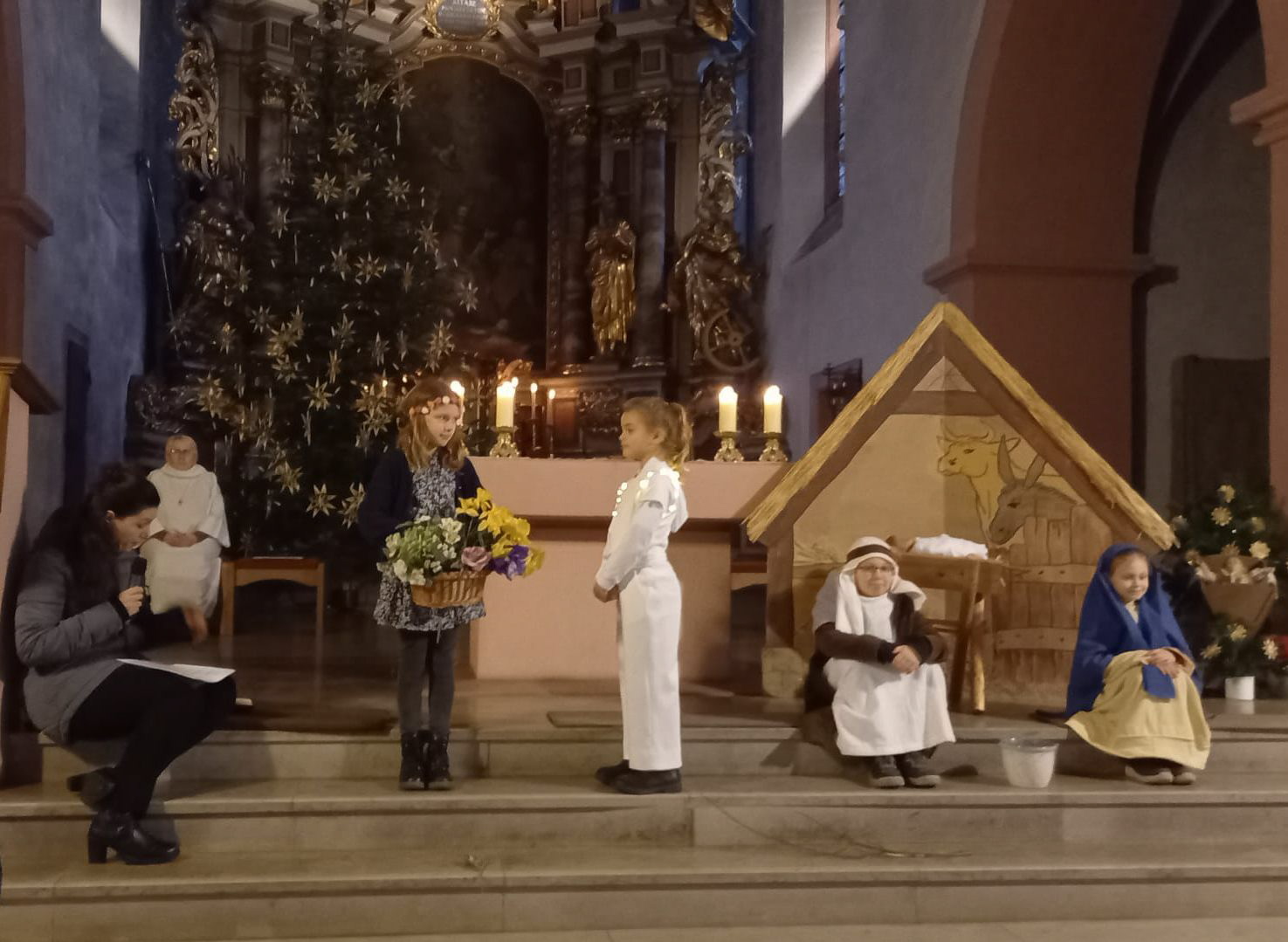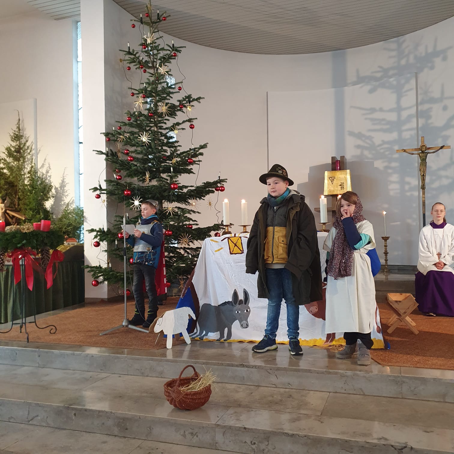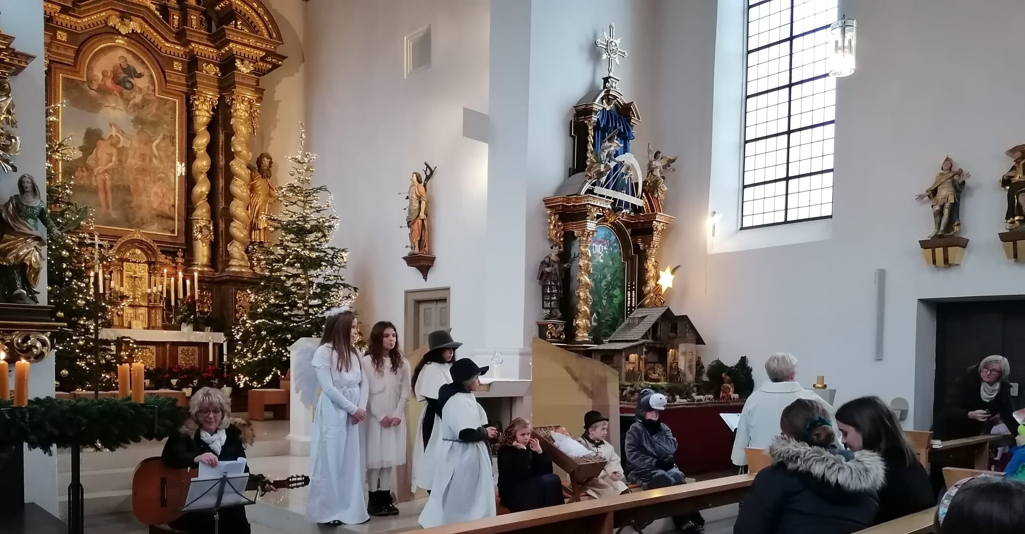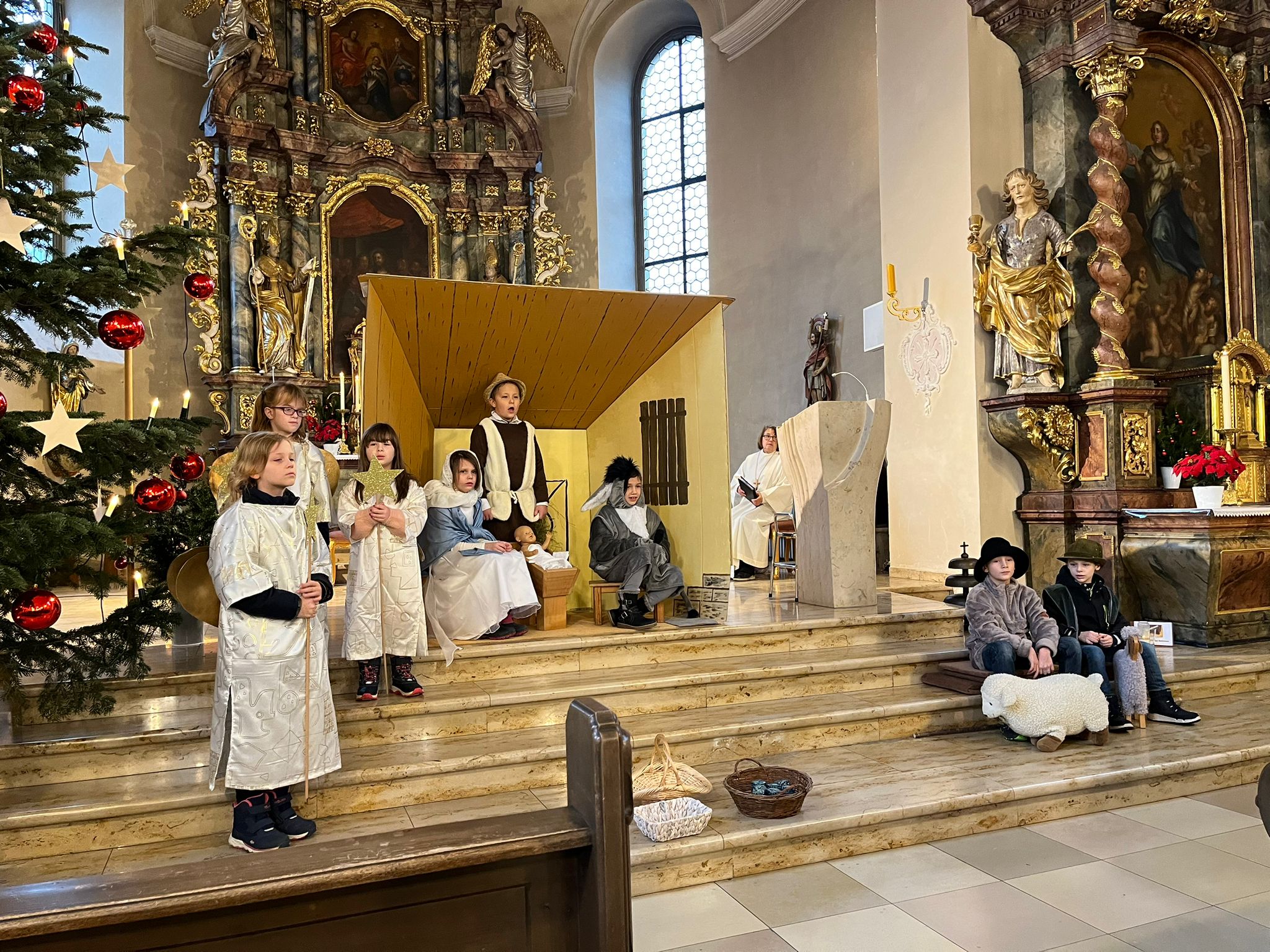 Am Nachmittag fanden dann in sechs weiteren Orten des pastoralen Raumes Kinderkrippenfeiern statt. Große und Kleine hatten sich aufgemacht um miteinander zu feiern und zu singen, zu sehen und zu hören, was vor über 2000 Jahren in Betlehem geschehen war und was der Evangelist Lukas aufgeschrieben hatte. Von der Band, über Orgel und Musikkapelle war für die musikalische Gestaltung gesorgt. In Nordheim trat zum ersten mal der neu gegründete Kinderchor des Gesangs- und Musikvereines auf. Die Akteure der Krippenspiele zeigten uns deutlich die Geschehnisse um die Geburt Jesus.