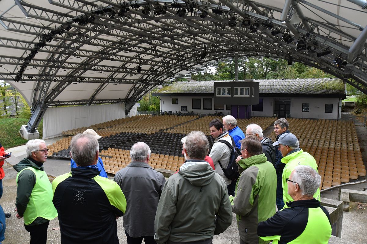 Höhepunkt der Radtour war der Besuch in Sömmersdorf, wo die Gruppe auch einen Blick hinter die Kulissen der Freilichtbühne werfen durfte, auf der alle fünf Jahre die Fränkischen Passionsspiele zu sehen sind. Zunächst fiel der Blick jedoch auf das neue Dach über den fast 2000 Zuschauerplätzen. Schriftführer Hubert Rüth berichtete vom Bau des Millionenprojekts, von aktuellen Entwicklungen und vor allem von der großen Passion der Sömmersdorfer für das biblisch motivierte Spiel. Insgesamt wirken 450 Einheimische mit, überwiegend als Laiendarsteller – bei einem Ort mit nicht mal 700 Einwohnern eine beeindruckende Zahl. Beeindruckt waren die Radler auch von der Bühne sowie den vielfältigen Gewändern und den teils blutigen Requisiten wie der Dornenkrone oder den Kreuzen im Rückgebäude.