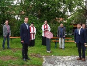 Mit der Frage, was der selige Liborius Wagner den Menschen im 21. Jahrhundert sagen kann, setzt sich ein Besinnungspfad in der Nähe der Kirche von Altenmünster auseinander. Dieser ist am Samstag, 23. Mai, eingeweiht worden. In die Kirche von Altenmünster wurde Wagners Leichnam 1661, 30 Jahre nach seinem Tod, umgebettet. „Antiquissimae fidei novus martyr“, schrieben die Augustiner-Chorherren vom Kloster Heidenfeld damals auf seinen Grabstein. Zu Deutsch heißt dieser Satz: „Des uralten Glaubens neuer Zeuge“. Von 1990 bis 2019 lud der „Pilgerhof“ in Altenmünster Menschen ein, sich mit dem Seligen auseinanderzusetzen, der von 1626 bis zu seinem Tod 1631 in Altenmünster und Sulzdorf Pfarrer war. „Hier verkündete er das Evangelium, hier teilte er das Leben mit den Menschen in den schwierigen Zeiten des 30-jährigen Krieges, hier in der Kirche, um die nun der Besinnungspfad läuft, feierte er die Sakramente“, erklärte Pfarrer Dr. Eugen Daigeler. Der Besinnungspfad wurde gemeinsam mit der Marktgemeinde Stadtlauringen errichtet, die als Bauherr die Last der praktischen Verantwortung trug. Daigeler dankte besonders Bürgermeister Friedel Heckenlauer. „Ohne sein großes Engagement und sein fachliches Wissen wäre es nicht zu diesem Projekt gekommen.“ Für die Gestaltung war Winfried Höhne verantwortlich. Neben den beiden größeren Tafeln am Weg zur Kirche, die über die Lebensgeschichte von Liborius Wagner informieren, laden sechs kleinere Tafeln, die am Weg um das Gotteshaus angebracht sind, ein, sich mit Eigenschaften dieses Seligen zu beschäftigen. Sein „Mut zum Aufbruch“ in Neues und Unbekanntes, seine Freiheit der Glaubens- und Gewissensentscheidung, sein Bemühen um Einheit, „Ausgleich und Versöhnung“ sowie seine Bereitschaft zur Ganzhingabe werfen „Fragen für unser heutiges Leben als Christen auf. Sie wollen einen altehrwürdigen Glaubenszeugen neu erschließen“, betonte Daigeler.