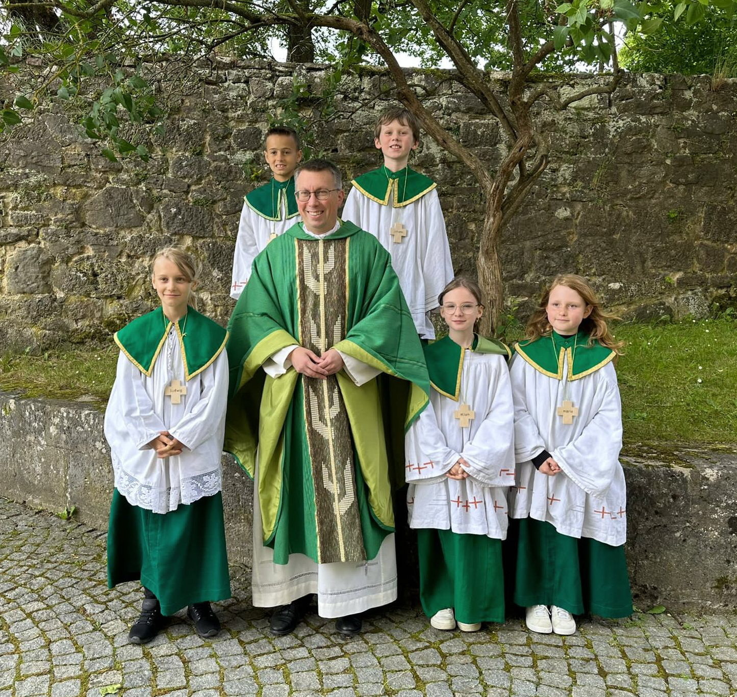 Beim Gottesdienst am 16.06.24 war es endlich soweit. Kaplan Elbert führte fünf neue Ministranten in ihren Dienst ein. Ministranten gehörten nach wie vor zum prägenden Bild der Gottesdienste, so der Kaplan. Er bedankte sich bei den Ministranten und betonte, dass ohne das Ehrenamt die Gemeinschaft der Kirche nicht bestehen könne. Umso schöner sei es, dass sich bereits Kinder in diese Gemeinschaft einbrächten und in diesem Amt weiterwachsen könnten.