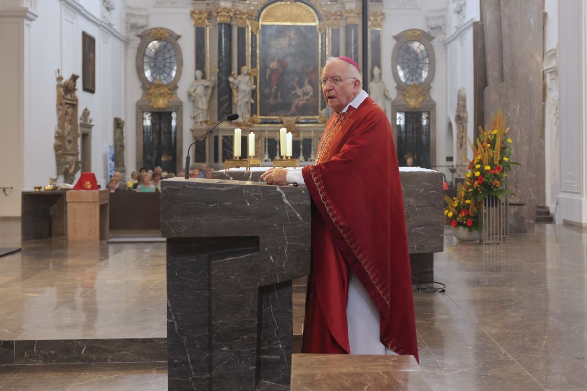 Würzburg/Bad Kissingen/Bad Neustadt/Schweinfurt/Haßfurt (POW) Zeuge und Pilger der Hoffnung ist man nicht mit großen Sprüngen und Sprüchen. „In kleinen Schritten und mit leisen Worten gilt es, tagtäglich neu das Evangelium von der Liebe Gottes zu bezeugen.“ Dazu lüden Kilian und seine Gefährten ein, betonte Weihbischof em. Ulrich Boom am Mittwoch, 9. Juli, beim Kiliani-Wallfahrtsgottesdienst für die Region Main-Rhön. Rund 500 Gläubige feierten im Kiliansdom mit. Viele von ihnen kamen mit von den jeweiligen Dekanatsbüros organisierten Bussen nach Würzburg.