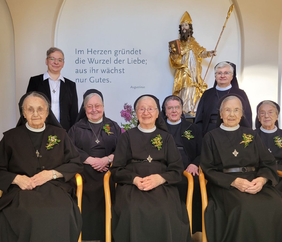 Domkapitular em. Monsignore Dietrich Seidel stand dem Gottesdienst vor. Nach dem Evangelium sagten die Schwestern mit festen Stimmen Gott zu: „Ich, Schwester…, bekräftige meine Hingabe an dich.“ Der Messe vorausgegangen war ein Einkehrtag, zu dem sich die Schwestern das Thema „Wechselnde Pfade, Schatten und Licht, alles ist Gnade…“ gewählt hatten. Die hochbetagten Schwestern erzählten von den Licht- und Schattenseiten ihres langen Ordenslebens. Auf 70 Jahre Profess blickten Schwester Assunta Ducrey (96) aus Tafers/Schweiz und Schwester Edeltraud Walter (93) aus Waldfenster in der Rhön zurück. 65 Jahre Profess feierten Schwester Pauline Hanauer (93) aus Geisthal (Bistum Regensburg), Schwester Dolores Schneider (90) aus Poppenhausen bei Schweinfurt und Schwester Ingrid Seufert (93) aus Rottershausen bei Bad Kissingen. 60-jähriges Professjubiläum hatte Schwester Goretti Gutting (82) aus Würzburg.