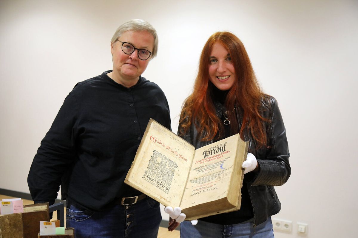 Ein Buch mit dem eigenen Namen oder einem Exlibris zu versehen, ist auch heute noch üblich. Die erste Seite einer Predigtsammlung zu den Sonntagsevangelien ist zu zwei Dritteln mit einem aufwendigen Exlibris von Johannes Mauritius Schwein bedeckt, der ab 1575 Pfarrer in Haßfurt war. „Taciturnitas“ – „Verschwiegenheit“ steht als Wahlspruch unter seinem Familienwappen mit dem Eberkopf. Darüber hat wiederum Pfarrer Hieronymus Degen, von 1601 bis zu seinem Tod im Jahr 1627 Stadtpfarrer von Haßfurt, sein Motto hinterlassen: „Multa tecum, pauca cum aliis loquere“ – „Sprich viel mit dir und wenig mit anderen“. Auf der gegenüberliegenden Seite stehen weitere Namen, die teilweise durchgestrichen oder weggekratzt wurden. „Diese Einträge erzählen, durch welche Hände das Buch gegangen ist. Es waren noch mindestens zwei spätere Besitzer“, sagt Willner und erklärt: „Manchmal hat man die Namen der Vorbesitzer ausgekratzt oder ausgeschnitten, um nicht des Diebstahls verdächtigt zu werden. Manchmal steht dabei, dass das Buch geschenkt oder gekauft wurde. Manchmal sogar der Kaufpreis und der Preis für die Bindung.“ Denn Bücher seien damals nicht mit Einband verkauft worden. „Man hat Druckbögen gekauft und es selbst einbinden lassen.“